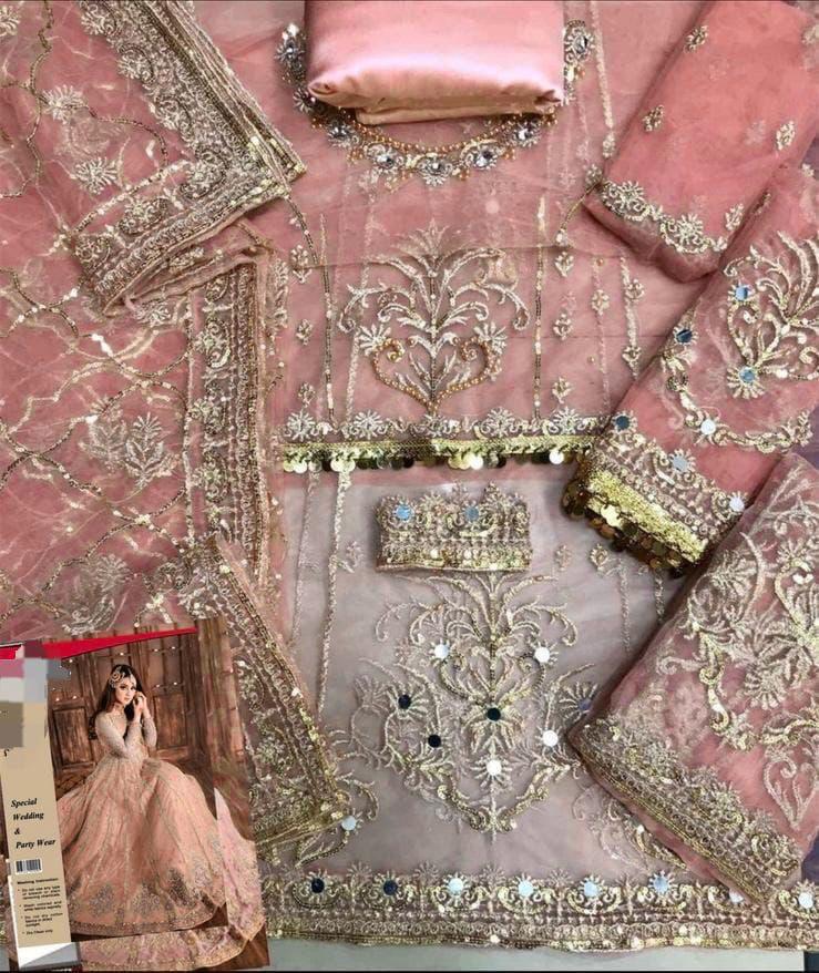 Zavian Collections laya hai aap ke liye ye ravishing long frock jis mein embroidery seedha fabric par ki gayi hai Is mein kisi extra applique ki zaroorat nahi aur sequence work ke sath mirror work ka haseen imtezaaj hai Silk trouser aur embroidered net dupatta is dress ki dilkashi ko mazeed barha dete hain