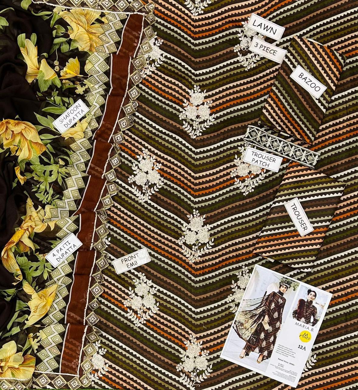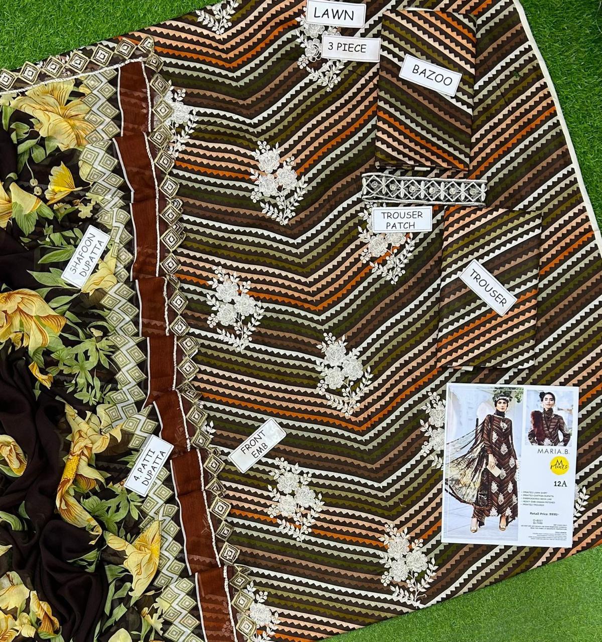 Zavian Collections pesh karta hai Maria.B ka ye super hit design. Is suit mein digital printed shirt ke sath front par heavy embroidery di gayi hai. Ready-to-wear chiffon dupatta jis par 4-side embroidered patti lagi hui hai, isay mazeed luxury touch deta hai. Har detail ko bariki se design kiya gaya hai.