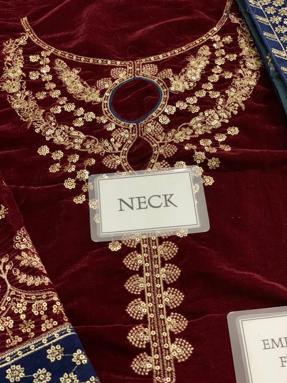 Pesh hai Jazmin ki luxury winter collection jo asli Micron Velvet 9000 par tayyar ki gayi hai. Shirt par heavy spangle embroidery ke sath laser cut work aur gotta chak ka kaam hai jo isay aik royal look deta hai. Is ke sath digital printed organza dupatta aur satin silk trouser ka combination isay wedding season ki top choice banata hai.