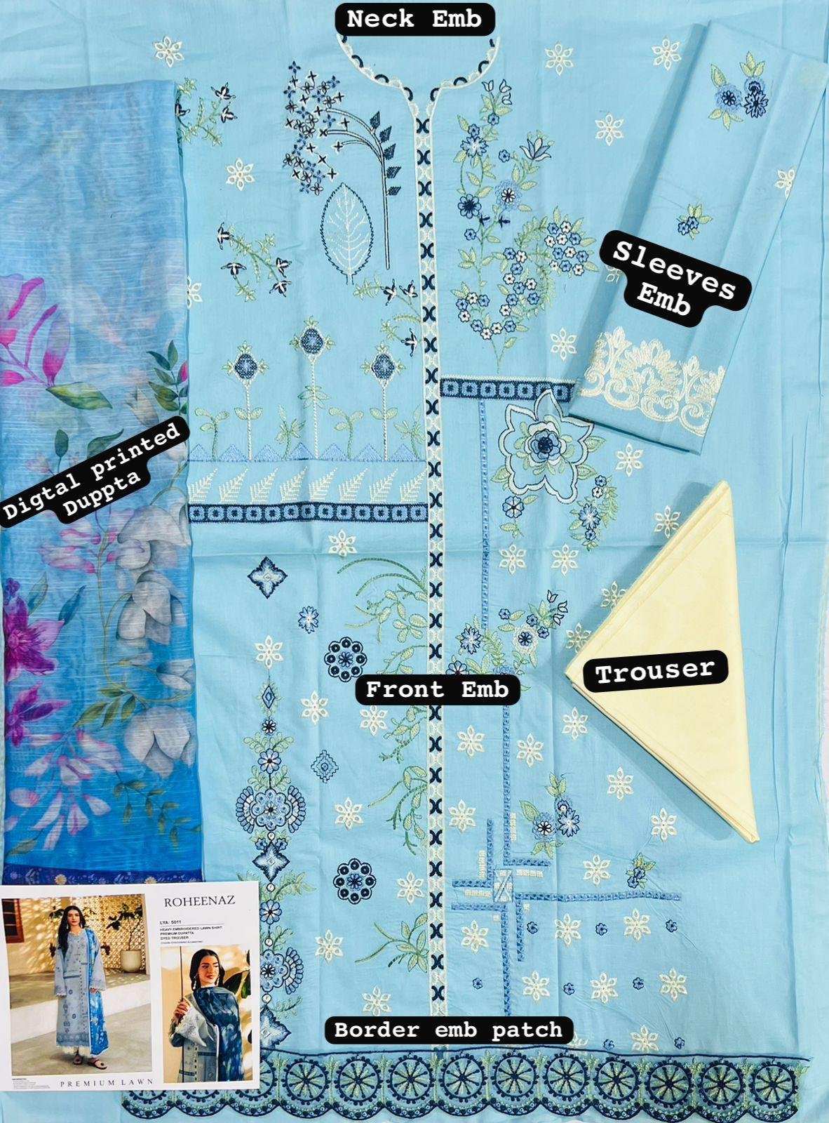 Zavian Collections laya hai Roheenaz ka sab se zyada pasand kiya jane wala design. Premium Lawn fabric par heavy embroidery aur nafees neck work isay behad dilkash banata hai. Is suit ki khaas baat iska Digital Printed Monark dupatta hai jo aap ki shaksiyat ko aik naya aur modern touch deta hai.